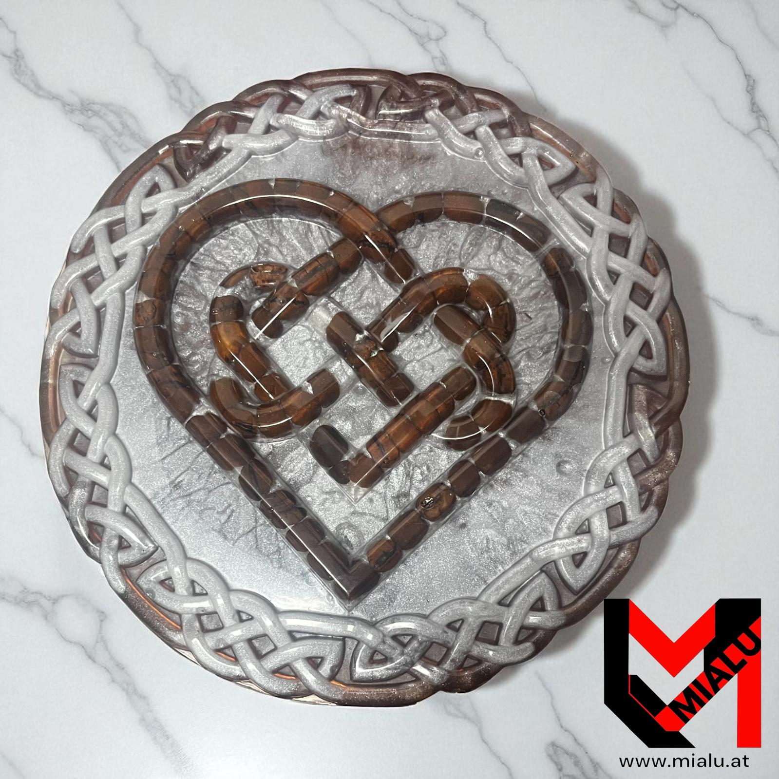 Dieses handgegossene Resin-Tablett vereint das kraftvolle keltische Knotenmuster mit einem stilvoll eingebetteten Herz aus echten Kaffeebohnen – ein Symbol für Erdung, Wärme und die kleinen Rituale des Alltags.