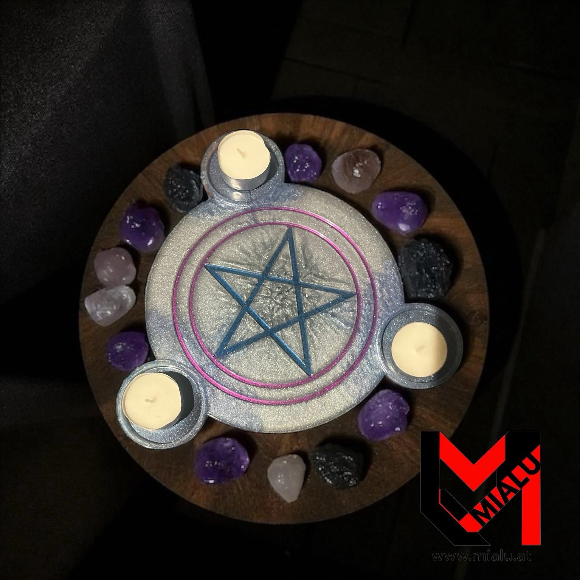 Dieser kunstvoll gestaltete Kerzenhalter vereint spirituelle Symbolik mit hochwertigem Design. In der Mitte befindet sich ein detailreich gearbeitetes Pentagramm, umrahmt von drei Teelichthaltern, die für stimmungsvolles Licht sorgen.